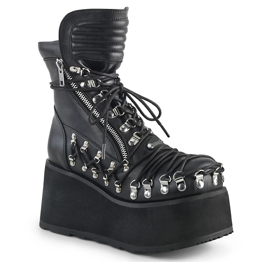 Platform Lace-Up Ankle High Gothic Boot Featuring Corset Style Lacing Up the Front with D-Rings, Puffed Extended Tongue
