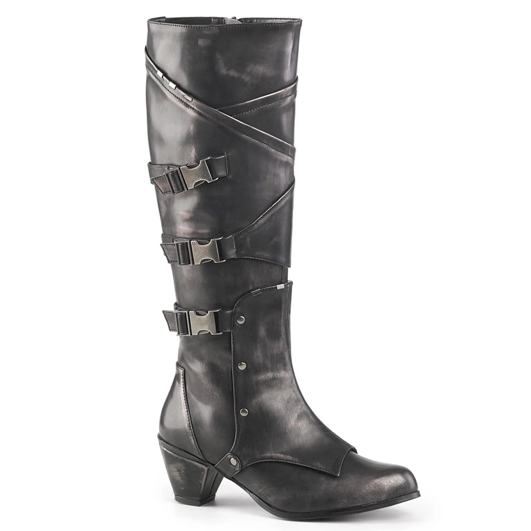 Knee High Boot with Metal Buckle Straps and Studding Detail
