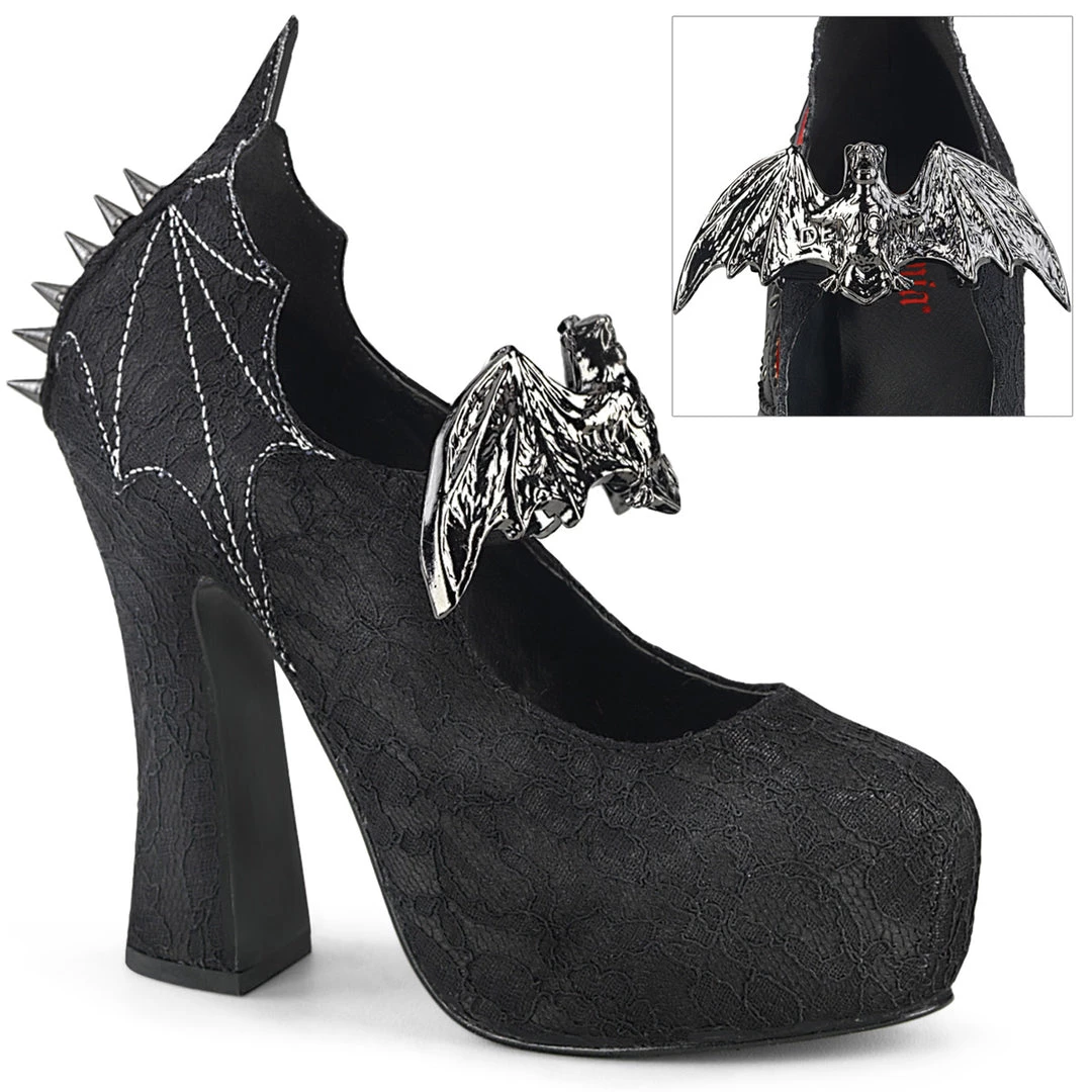 Concealed Platform Slip-On Black Satin Mary Jane Pump Featuring Elastic Strap with Large Metal Bat & Cone Spike Studded Bat Wing Detail on the Heel Cap