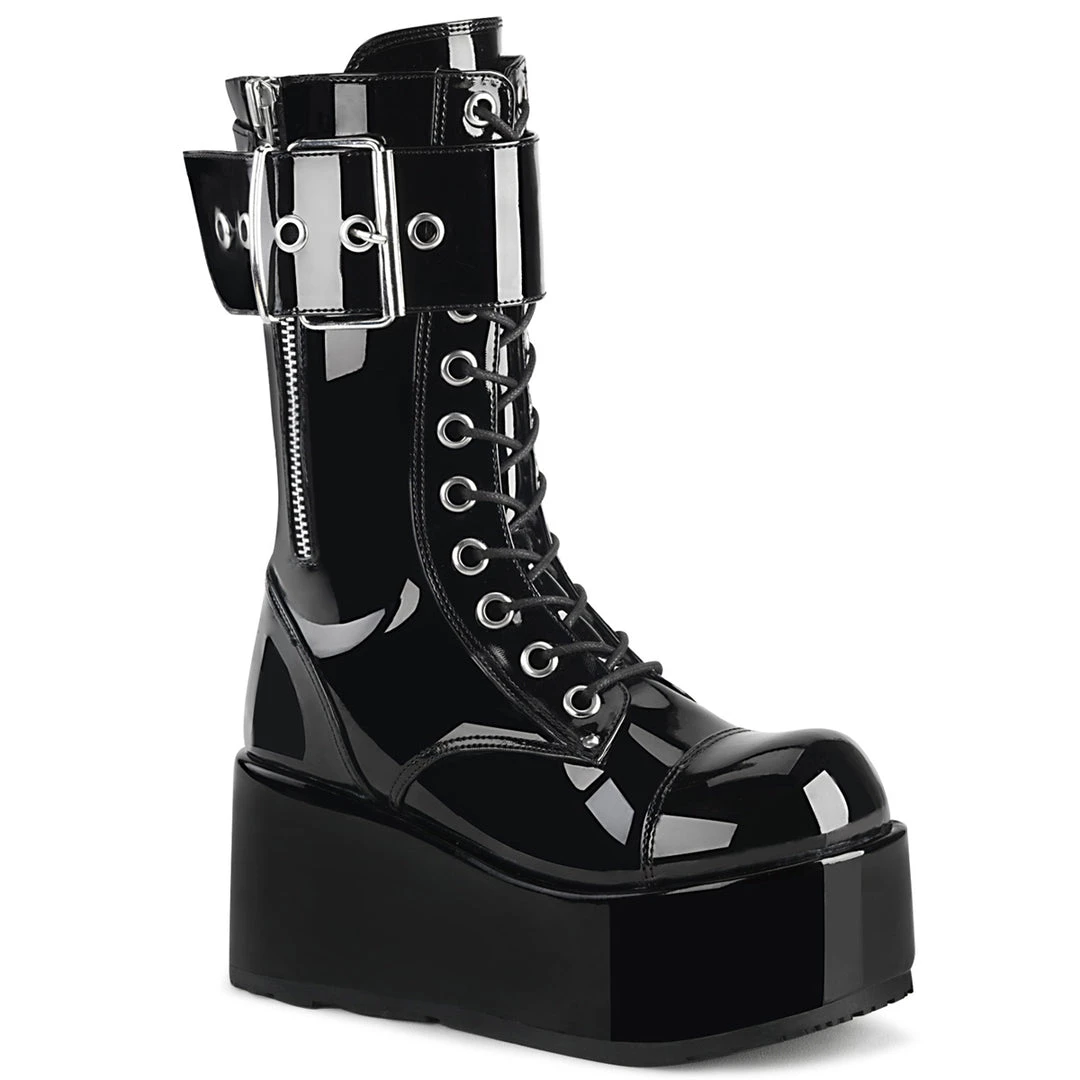 Black Patent Platform Lace-Up Mid-Calf Boot Featuring Ornamental Inner & Outer Zipper Details and Oversize Buckle Strap