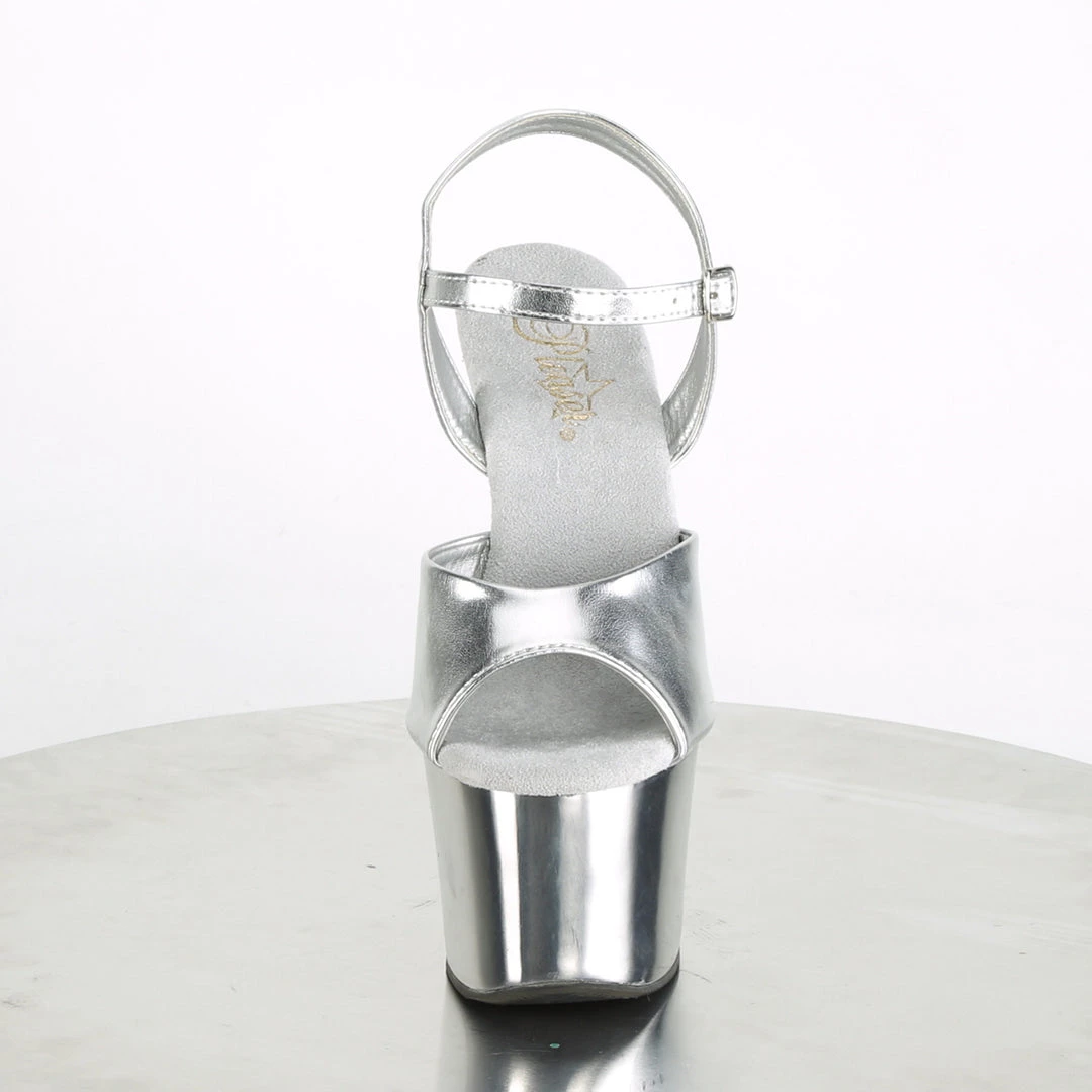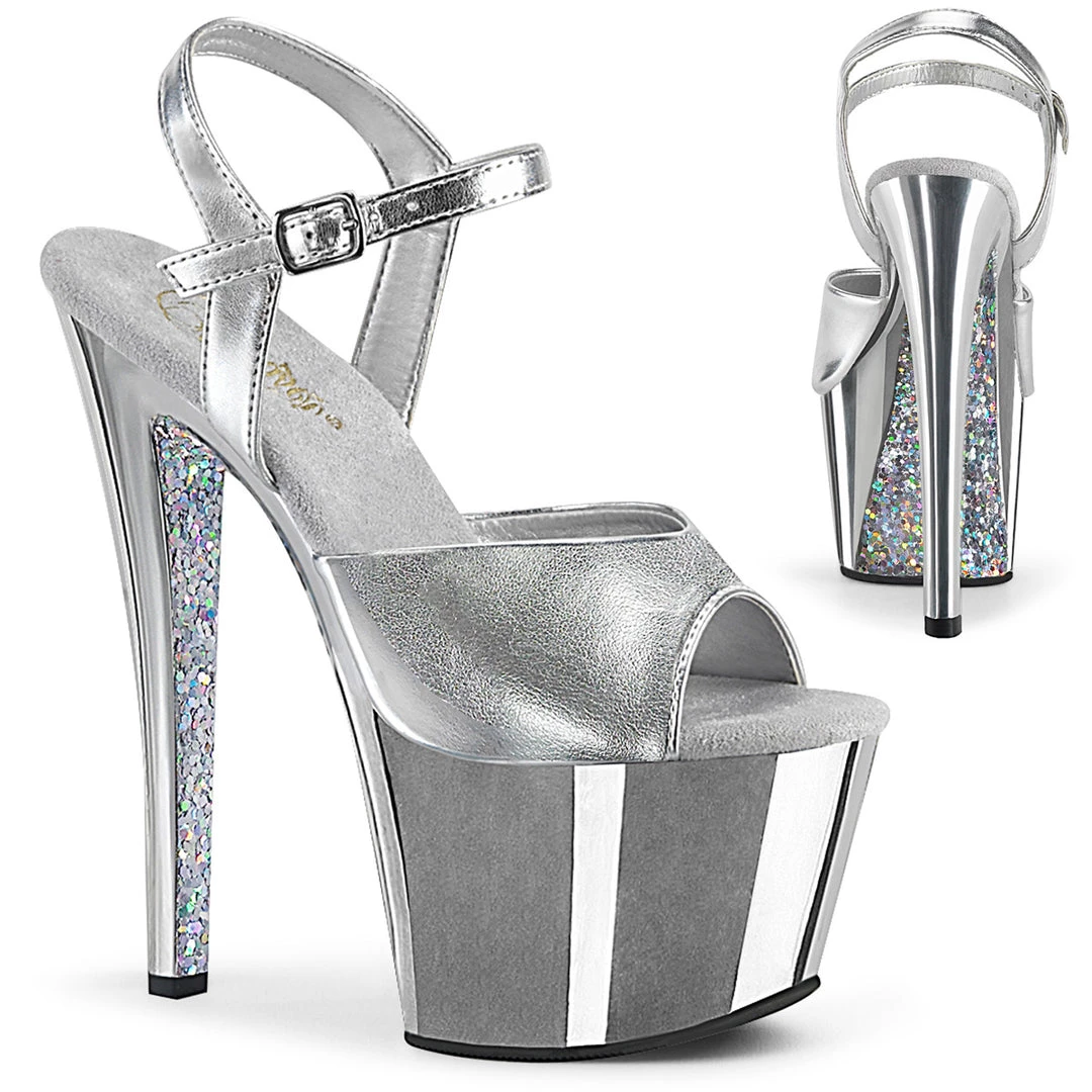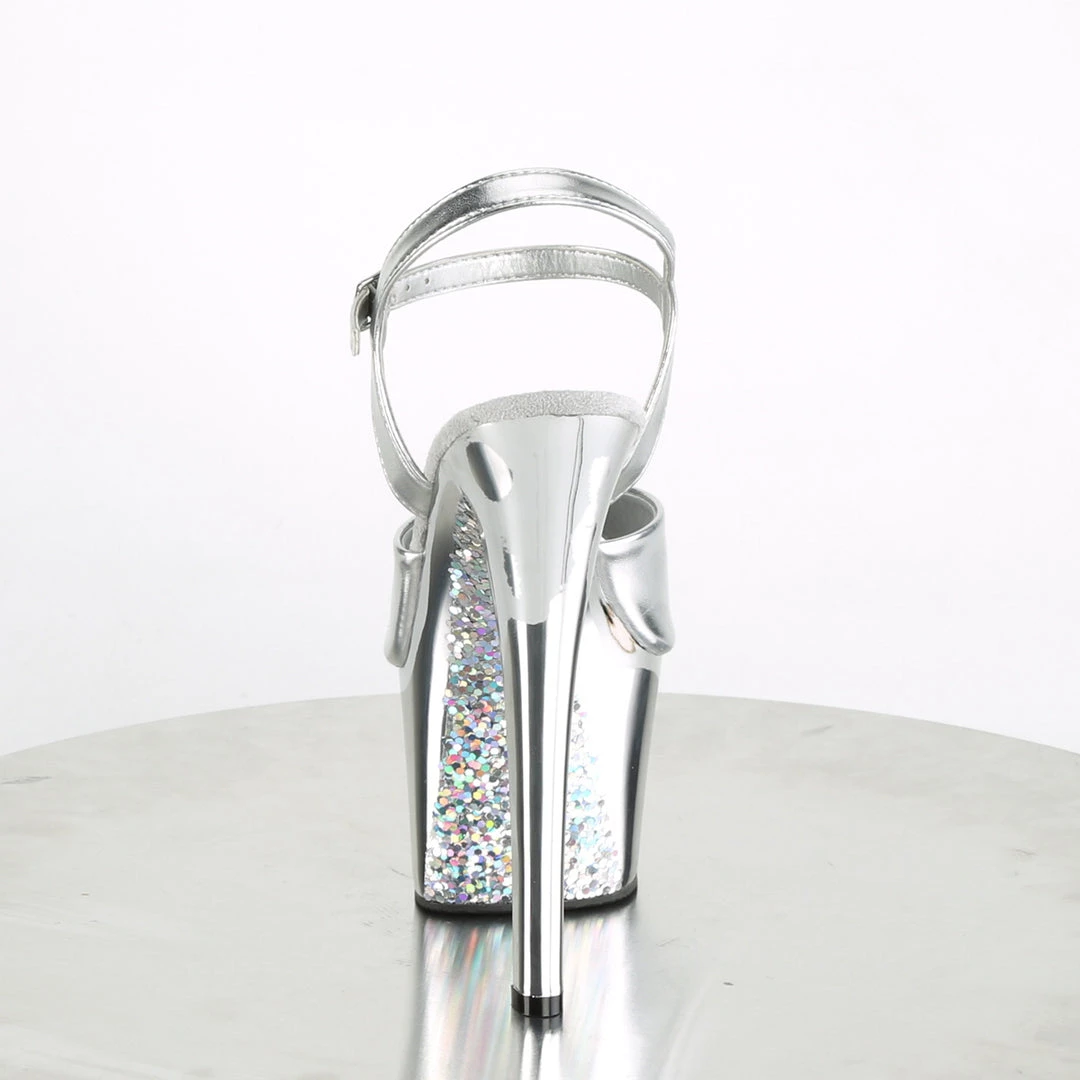 Platform Ankle Strap Stripper Sandal Featuring Chrome Plated Platform Silver Multi Glitter Platform Underside & Front of Heel