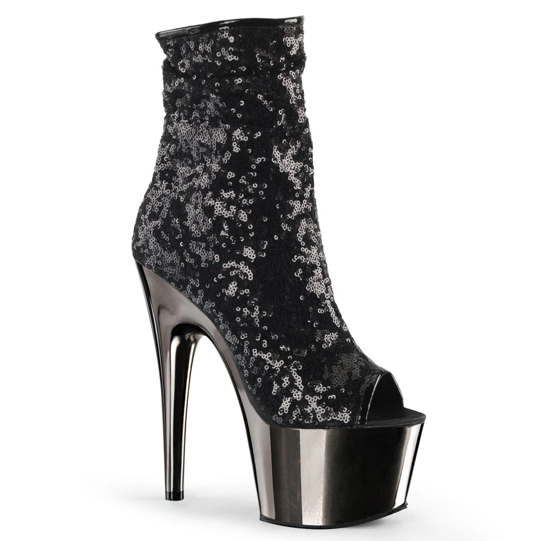 Chrome Plated Platform Peep Toe Ruched Shaft Ankle High Stripper Boots.