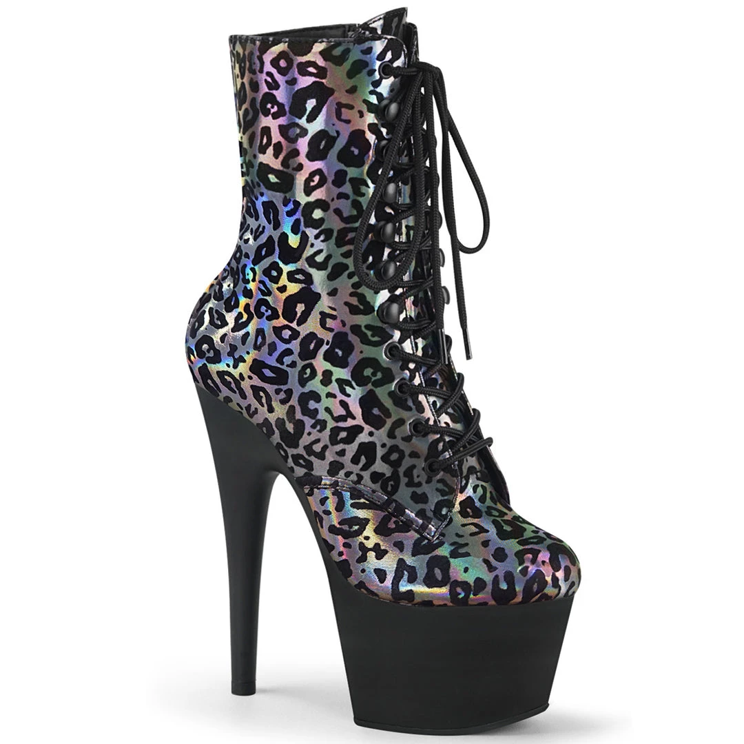 Platform Lace-Up Front Ankle Boot with Holographic Leopard Print Upper