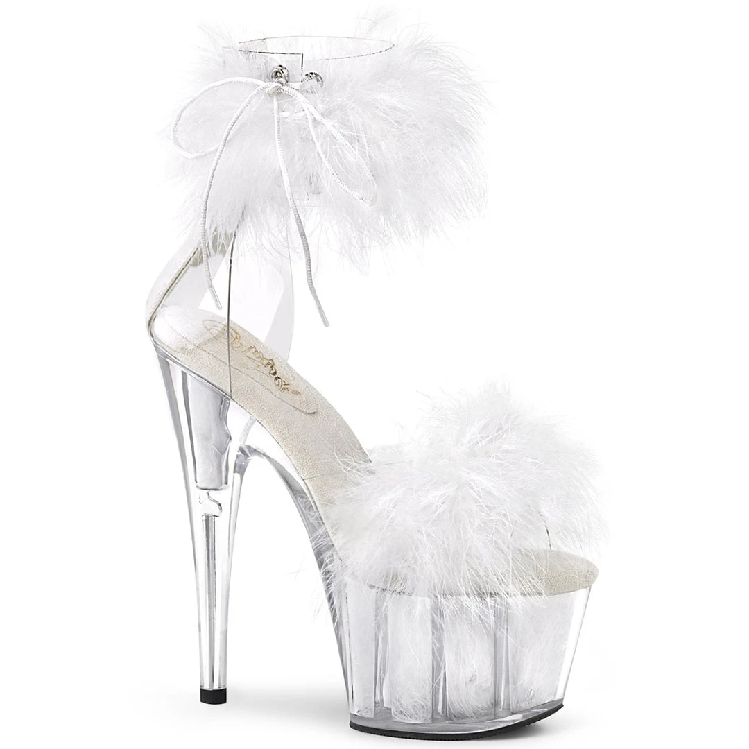 Platform Close Back Ankle Cuff‚ Stripper‚ Sandal Featuring White Marabou Fur on Vamp and Inside the Platform Bottom, Side Lacing & Back Zip Closure