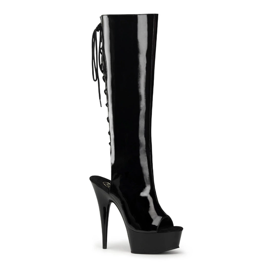 Black Patent Platform Open Toe/Heel, Lace-Up Back Knee High Pole Dancer Boot‚Â