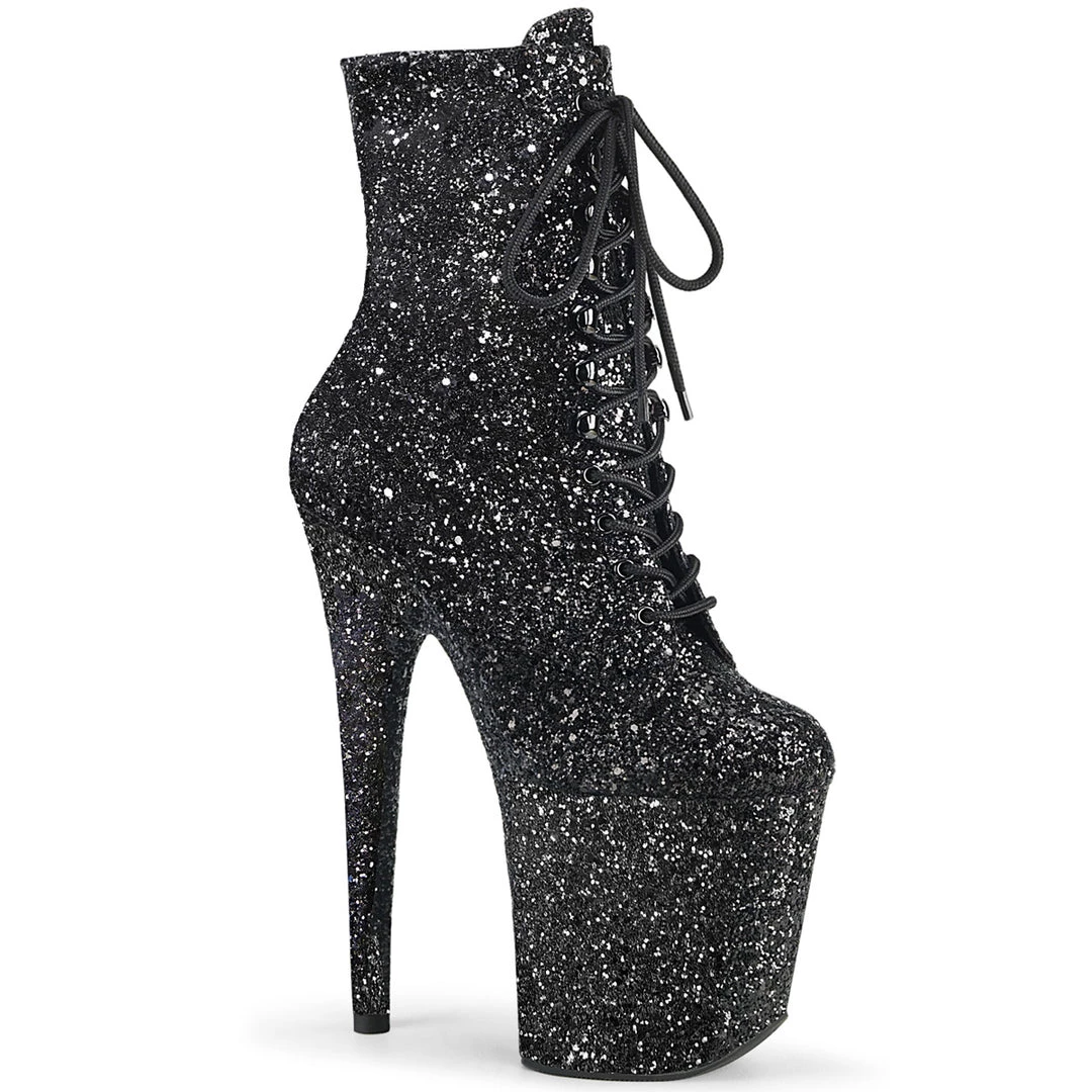 Platform Lace-Up Front Black Glitter Ankle Boot Featuring Fully Wrapped Platform Bottom