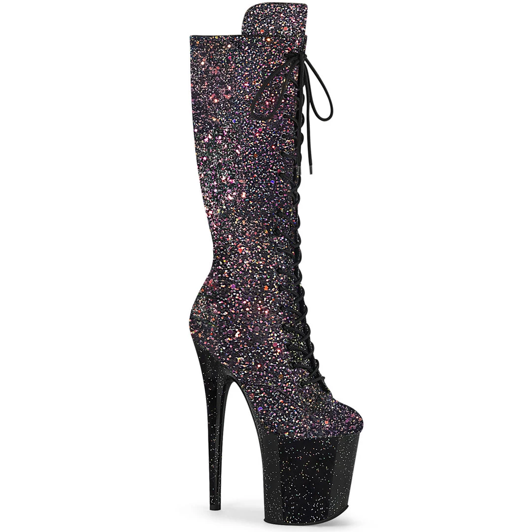 Platform Lace-Up Front Knee High Boot Featuring Mini Iridescent Glitters on the Entire Platform Bottom