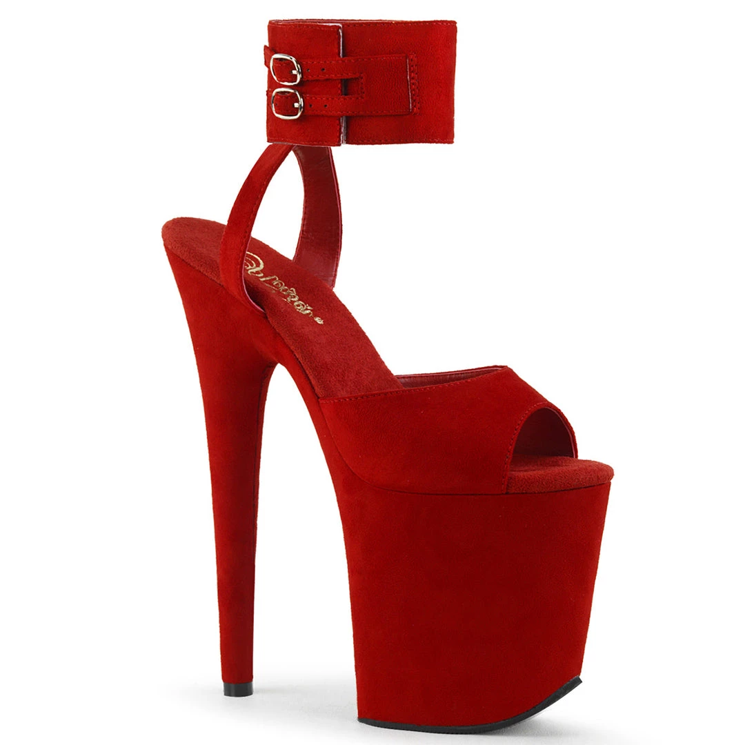 Red Faux Suede Platform Ankle Strap Sandal Featuring Wide Ankle Band with Dual Buckle Straps