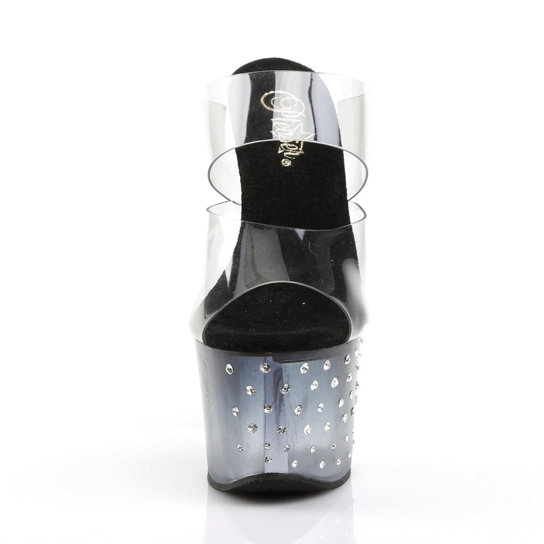 Two Band Slide Featuring Multi-Size Rhinestones Studded on the Black Tinted Heel and Outer Side of the Black Tinted Platform