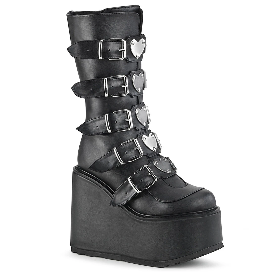 Platform Mid-Calf Boot Featuring 5 Buckle Straps with Heart Shaped Metal Plates at Center