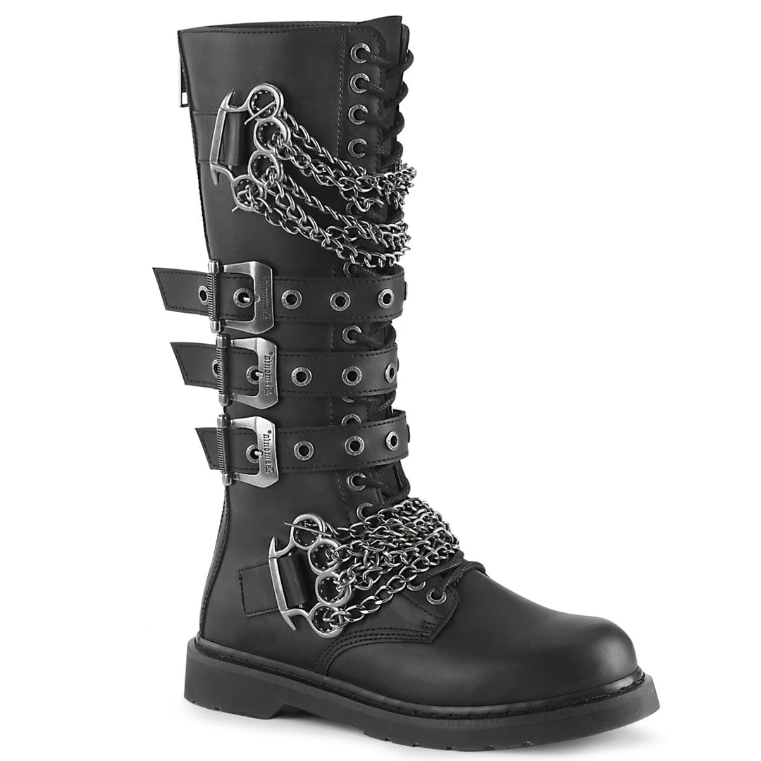 20 Eyelet Unisex Knee High Combat Boot Featuring Triple Buckle Straps and Brass Knuckles with Chain Detail