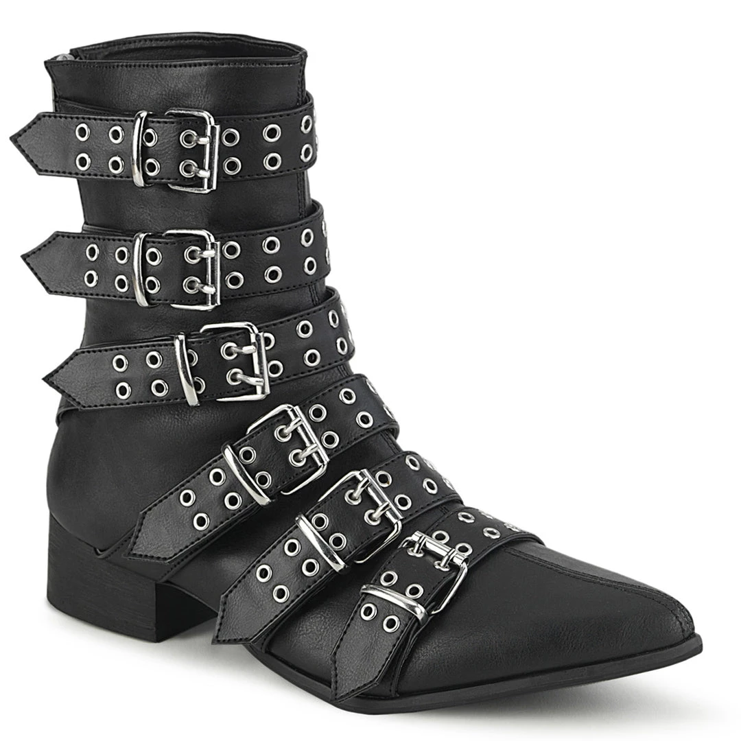 Block Heel Pointed Toe Winklepicker Style Calf High Boot Featuring Multi Double Grommet Buckle Straps