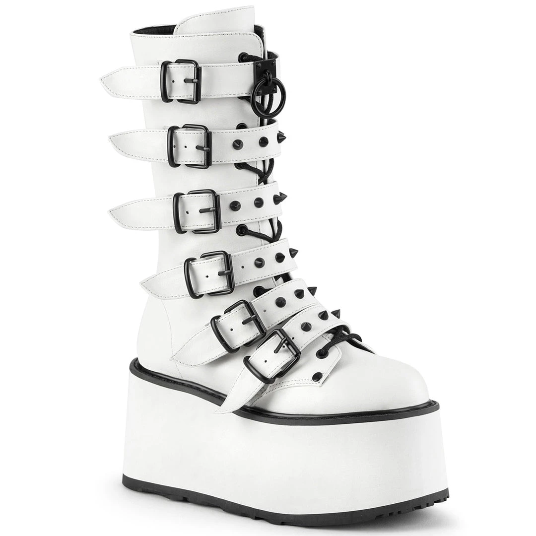 Platform Lace-Up Front White Mid-Calf Gothic Boot Featuring 6 Cone-Studded Buckle Straps